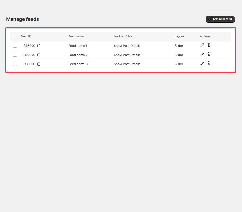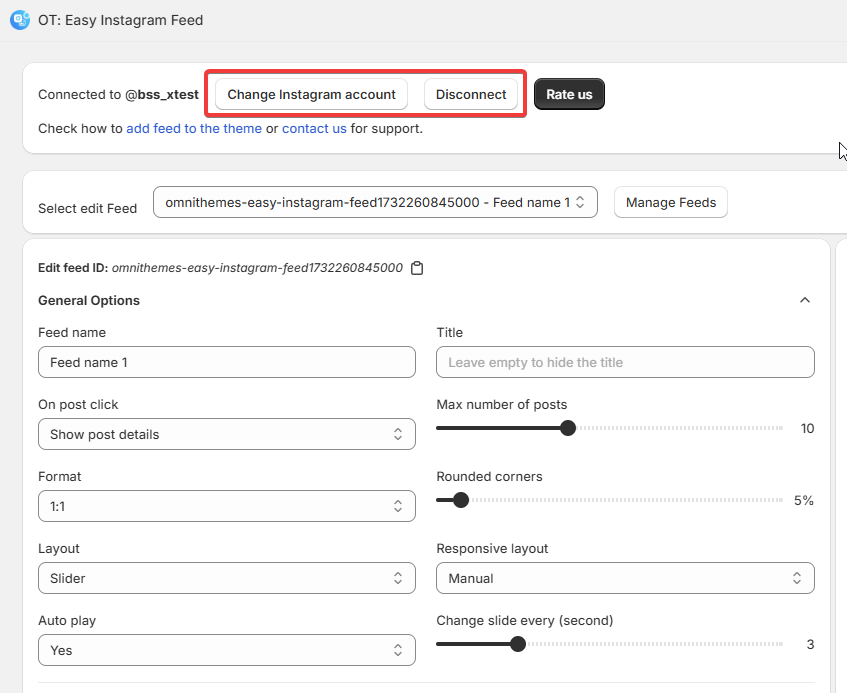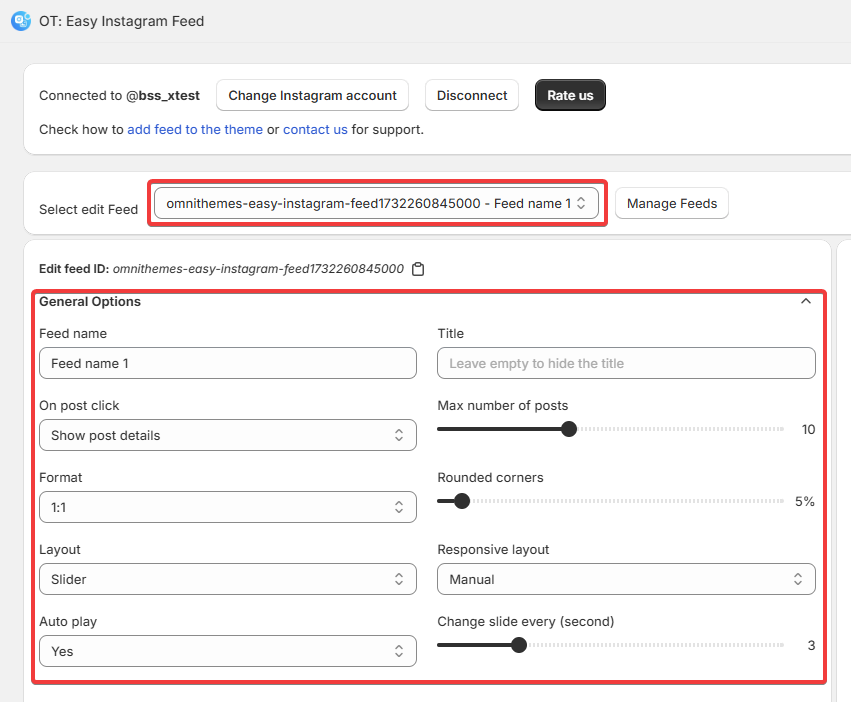 Choose the Feed you want to customize. Then, you can customize the title, post click actions, format, spacing, rounded corners, number of posts, and layout (grid or slider). The preview section allows you to visualize the changes in real-time.